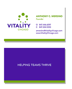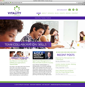 Project: Branding, Logo, Website, PowerPoint and Proposal Template Design. The new logo focuses on the goal of the Client – making business teams better, bigger, stronger – Helping Teams Thrive. The new logo demonstrates this with a growing, thriving team emanating from Vitality. The individual circles represent each member of the growing team.