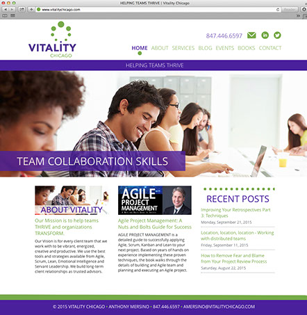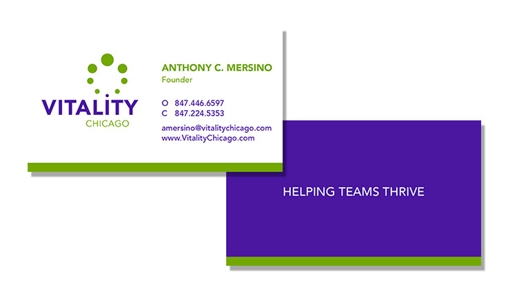 The new logo focuses on the goal of the Client – making business teams better, bigger, stronger – Helping Teams Thrive. The new logo demonstrates this with a growing, thriving team emanating from Vitality. The individual circles represent each member of the growing team.